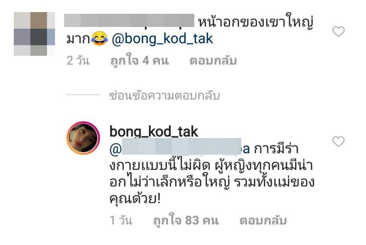 งานนี้สาวตั๊ก เลยคอมเมนต์สวนกลับไปว่า "การมีร่างกายแบบนี้ไม่ผิด ผู้หญิงทุกคนมีหน้าอกไม่ว่าเล็กหรือใหญ่ รวมทั้งแม่ของคุณด้วย !"