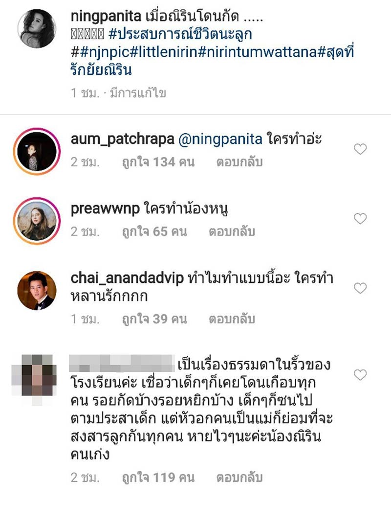 งานนี้ก็มีแฟน ๆ เข้าไปสอบถามด้วยความเป็นห่วงเป็นจำนวนมากว่า น้องณิริน ไปโดนใครกัดมา พร้อมสงสารที่น้องต้องมาเจอกัดแบบนี้ รอยใหญ่เต็มแขน แถมเห็นเป็นรอยฟันชัดเจน คงเจ็บน่าดู ซึ่งหลายคนก็ให้ความเห็นว่า น่าจะเป็นเพื่อน ๆ ที่โรงเรียน คาดว่าน่าจะเป็นเด็ก ๆ เล่นกัน แต่ก็เข้าใจหัวอกคนเป็นแม่ว่าคงใจสลายแน่ ๆ ที่ลูกสาวต้องมาเจ็บตัวแบบนี้