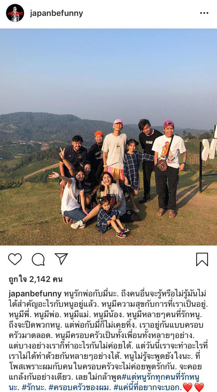 จากนั้น น้องเจแปน ลูกชายคนโตก็ได้โพสต์ภาพตอนไปเที่ยวกันแบบครอบครัว พร้อมระบุว่า หนูรักพ่อกับมี้นะ ถึงคนอื่นจะรู้หรือไม่รู้ มันไม่ได้สำคัญอะไรกับหนูอยู่แล้ว หนูมีความสุขกับการที่เราเป็นอยู่ หนูมีพี่ มีพ่อ มีแม่ มีน้อง หนูมีหลาย ๆ คนที่รักหนู ถึงจะปิดพวกหนู แต่พ่อกับมี้ก็ไม่เคยทิ้ง เราอยู่กันแบบครอบครัวมาตลอด