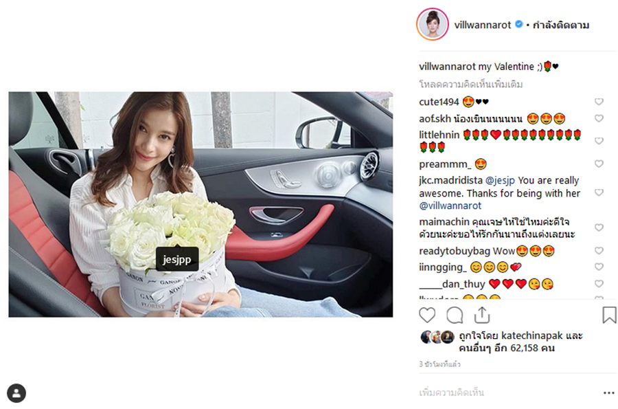 โดยล่าสุด (14 กุมภาพันธ์ 2562) ในวันวาเลนไทน์นี้คู่เลิฟคู่ใหม่ก็ไม่พลาดออกมาโชว์ความหวานเหมือนคู่อื่น ๆ เขาด้วย หลัง สาววิว ออกมาเผยกุหลาบสีขาวช่อโต พร้อมแคปชั่นว่า "my Valentine ;)" พร้อมกับแท็กไปหา หนุ่มเจษ ซึ่งก็เป็นการบอกว่าเจ้าของช่อดอกไม้สวย ๆ นี้ก็คือพระเอกหนุ่มนั่นเอง ทำเอาแฟนคลับเข้ามาคอมเมนต์แซวกันเกรียวกราว พร้อมบอกว่า คู่นี้น่ารักมาก ๆ แถมยังพากันคอมเมนต์ขอรูปคู่กันรัว ๆ อีกด้วย