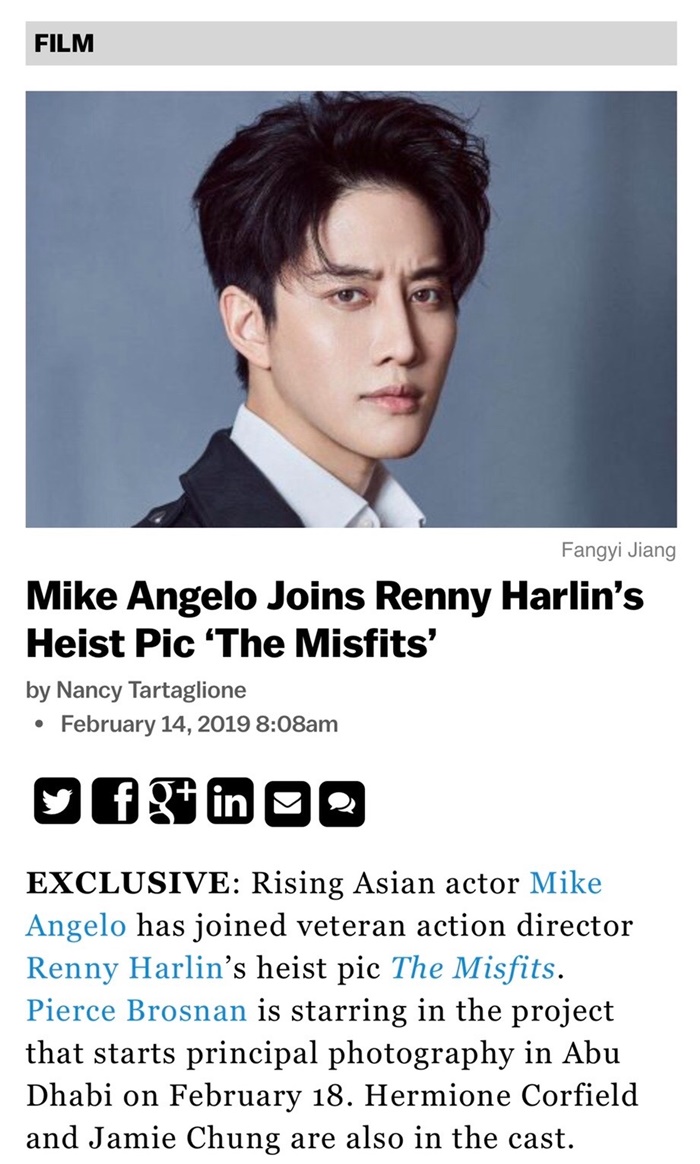 โดยรายงานเปิดเผยว่า หนุ่มไมค์ เตรียมเปิดกล้องภาพยนตร์เรื่องใหม่กับซุปตาร์ชื่อดัง เพียร์ซ บรอสแนน หรือที่หลายคนรู้จักจากบทพระเอก เจมส์ บอนด์ 007 กับภาพยนตร์เรื่อง The Misfits จากฝีมือผู้กำกับแอ็คชั่นมากประสบการณ์ เรนนี่ ฮาร์ลิน รวมทั้งนักแสดง เฮอร์โมไอนี่ คอร์ฟิลด์ และ เจมี่ ชุง ร่วมด้วยทีมงานฮอลลีวูด