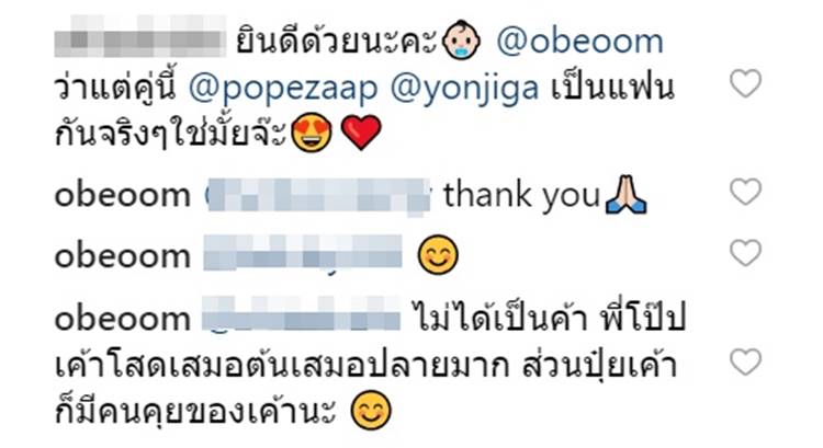 แต่ล่าสุด (17 กุมภาพันธ์ 2562) ไฮโซโอบอุ้ม ซึ่งเพิ่งคลอดลูกและถูกโยงไปเอี่ยวกับเรื่องนี้ เพราะมีภาพขณะโป๊ป และโฮโซยนจิกา มาเยี่ยมที่โรงพยาบาล ก็ได้คอมเมนต์ตอบกลับคนที่เข้ามาถามถึงสถานะของทั้งคู่ด้วยว่าเป็นแฟนกันจริงหรือเปล่า โดยไฮโซโอบอุ้ม ตอบกลับว่า "ไม่ได้เป็นค้า พี่โป๊ปเค้าโสดเสมอต้นเสมอปลายมาก ส่วนปุ๋ยเค้าก็มีคนคุยของเค้านะ"