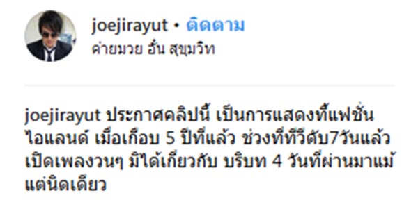 กระทั่งเวลาต่อมา โจ นูโว ได้ออกมาเผยเกี่ยวกับประเด็นดังกล่าวว่า "ประกาศ คลิปนี้ เป็นการแสดงที่แฟชั่น ไอส์แลนด์ เมื่อเกือบ 5 ปีที่แล้ว ช่วงที่ทีวีดับ 7 วันแล้วเปิดเพลงวน ๆ มิได้เกี่ยวกับ บริบท 4 วันที่ผ่านมาแม้แต่นิดเดียว"