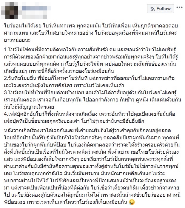 ล่าสุด (24 กุมภาพันธ์ 2562) สาวโบว์ ได้ออกมาเปิดใจชี้แจงผ่านเฟซบุ๊กส่วนตัว เล่าความจริงทุกอย่างและความรู้สึกของตัวเอง โดยตลอดเวลาที่ผ่านมา ตนเองไม่เคยรับรู้มาก่อนว่าฝ่ายชายมีคนอื่น ไม่ได้รู้แล้วทนเหมือนที่คนอื่นคิด ถ้ารู้ว่าเป็นความสัมพันธ์ 3 คน คงไม่มีทางยอมทน เพราะความรักครั้งนี้คือรักครั้งแรกของตัวเอง