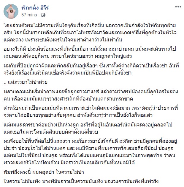 แรปเปอร์หนุ่มกล่าวอีกว่า ขอยืนยันว่าตัวเองไม่ใช่ ป๊อบ ปองกูล ซึ่งตนรักและให้ความเคารพเสมอ ตอนนี้สถานะความสัมพันธ์กับภรรยาก็เป็นไปด้วยดี รักกันดีมาก น้องชูใจก็ไม่ใช่เด็กบ้านแตก นอกจากนี้แล้ว เจ้าตัวยังทิ้งท้ายโพสต์เครียด ๆ อย่างขำ ๆ ว่า ได้ทำแผนภูมิภาพคนอ้วนมีเครามาให้ชาวเน็ตได้ดู เพราะจะเหมาว่าคนหุ่นหมีหน้าแบบนี้จะเป็นคนเดียวกันไปหมด มันเป็นไปไม่ได้