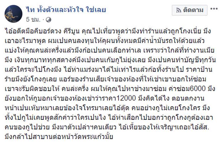 "ไอ้อดีตมือคีย์บอร์ดวง คีรีบูน คุณไปเที่ยวพูดว่ามึงทำร้านแล้วถูกโกงเนี่ย มึงเอาอะไรมาพูด ผมเป็นคนลงทุนให้คุณทั้งหมด มีค่าน้ำมันรถให้ด้วย แล้วแบ่งให้คุณคนละครึ่ง แล้วมึงก็เป็นคนเลือกทำเล เพราะว่าใกล้ที่ทำงานเมียมึง เงินทุกบาททุกสตางค์มึงเป็นคนเก็บกูไม่ยุ่งเลย มึงเป็นคนทำบัญชีทุกวันแล้วใครจะไปโกงมึง ไอ้ห่าแมร่งมาได้ไม่เท่าไรแล้วก็ทิ้งร้านไป ราคาป้ายร้านมึงยังโกงกูเลย แอร์ของร้านเสียเจ้าของห้องที่ให้เช่าเขาบอกให้ซ่อมเขาจะรับผิดชอบให้ คนละครึ่ง ผมให้คุณไปหาช่างมาซ่อม ค่าซ่อม 6,000 มึงยังบอกให้กูบอกเจ้าของห้องเช่าว่าราคา 12,000 มึงคิดได้ไง
