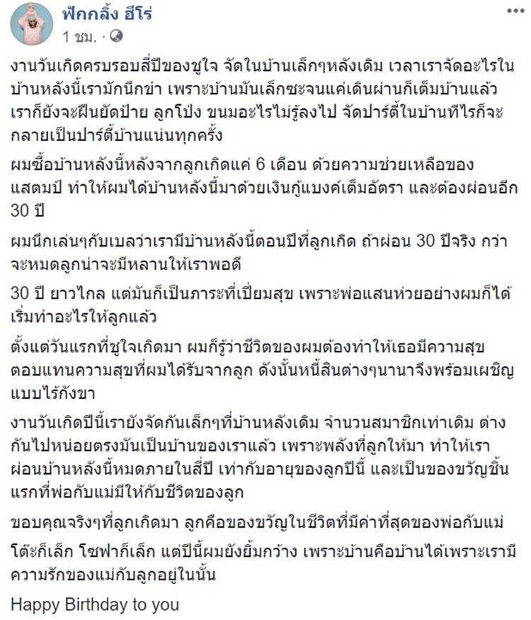 เผยภาพครอบครัวอบอุ่นแสนสุขให้แฟน ๆ ของ น้องชูใจ ได้กดไลก์ และถือโอกาสในงานปาร์ตี้วันเกิดลูกสาวที่จัดขึ้นในวันนี้ (26 กุมภาพันธ์ 2562) เล่าเรื่องราวดี ๆ ให้ทุกคนได้ยินดีกันด้วย โดยคุณพ่อ กอล์ฟ ฟักกลิ้ง ฮีโร่ เผยว่า "งานวันเกิดครบรอบสี่ปีของชูใจ จัดในบ้านเล็ก ๆ หลังเดิม เวลาเราจัดอะไรในบ้านหลังนี้เรามักนึกขำ เพราะบ้านมันเล็กซะจนแค่เดินผ่านก็เต็มบ้านแล้ว เราก็ยังจะฝืนยัดป้าย ลูกโป่ง ขนมอะไรไม่รู้ลงไป จัดปาร์ตี้ในบ้านทีไรก็จะกลายเป็นปาร์ตี้บ้านแน่นทุกครั้ง