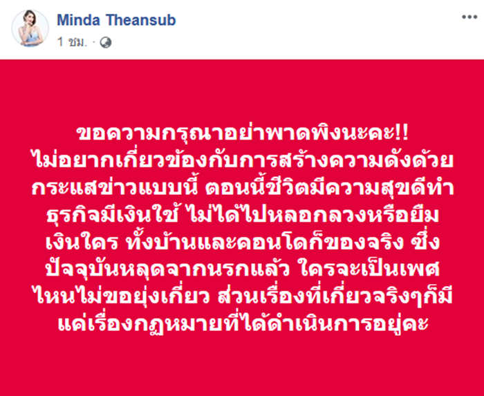 อย่างไรก็ตาม ภายหลังที่โพสต์ดังกล่าวไปก็มีหลายคนวิพากษ์วิจารณ์ไม่น้อย ซึ่งทาง มินดา ก็ได้ออกมาโพสต์อีกรอบว่า "ขอความกรุณาอย่าพาดพิงนะคะ !! ไม่อยากเกี่ยวข้องกับการสร้างความดังด้วยกระแสข่าวแบบนี้ ตอนนี้ชีวิตมีความสุขดีทำธุรกิจมีเงินใช้ ไม่ได้ไปหลอกลวงหรือยืมเงินใคร ทั้งบ้านและคอนโดก็ของจริง ซึ่งปัจจุบันหลุดจากนรกแล้ว ใครจะเป็นเพศไหนไม่ขอยุ่งเกี่ยว ส่วนเรื่องที่เกี่ยวจริง ๆ ก็มีแค่เรื่องกฎหมายที่ได้ดำเนินการอยู่คะ"