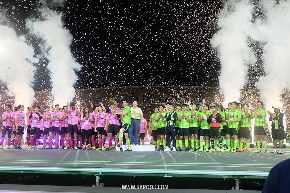 และไฮไลท์ของงาน อย่างการแข่งขันฟุตบอลประจำปี ที่ปีนี้มาทั้ง 2 ทีม นำมาโดย ทีมสีเขียว กัปตันบอย ปกรณ์ และ สีชมพู กัปตันเกรท วรินทร ก็สนุกสนานตื่นเต้นไม่แพ้โชว์ขบวนพาเหรด เพราะแข่งกันอย่างสูสี นักแสดงชายแต่ละคนทุ่มเทแรงกายแรงกันสุดใจ ก่อนจะจบลงด้วยสกอร์เสมอ ทั้งแข่งในเวลาและการยิงจุดโทษ จนได้ครองถ้วยด้วยกันไปในที่สุด เรียกว่าเป็นแมตช์หยุดโลกที่ใคร ๆ ต่างก็เฝ้ารอ