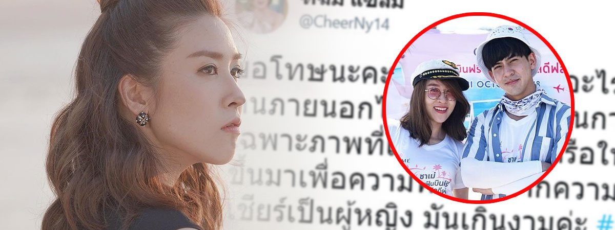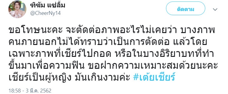 "ขอโทษนะคะ จะตัดต่อภาพอะไรไม่เคยว่า บางภาพคนภายนอกไม่ได้ทราบว่าเป็นการตัดต่อ แล้วโดยเฉพาะภาพที่เชียร์ไปกอด หรือในบางอิริยาบถที่ทำขึ้นมาเพื่อความฟิน ขอฝากความเหมาะสมด้วยนะคะ เชียร์เป็นผู้หญิง มันเกินงามค่ะ #เต้ยเชียร์"