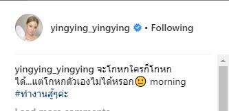 อย่างไรก็ตาม ต่อมา ญิ๋งญิ๋ง ก็ได้ออกมาโพสต์ไอจีตอกย้ำว่า "จะโกหกใครก็โกหกได้...แต่โกหกตัวเองไม่ได้หรอก🙂 morning #ทำงานสู้ ๆ ค่ะ"