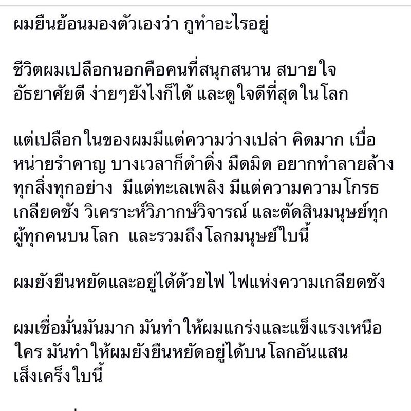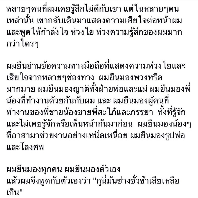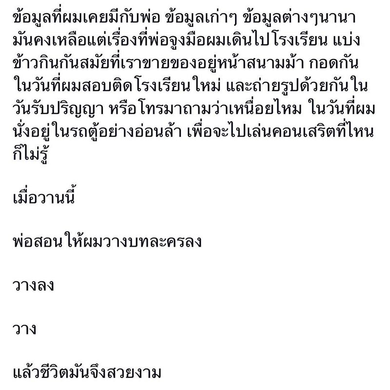 โดยเป็นข้อความที่เจ้าตัวได้เล่าถึงเหตุการณ์ในงานศพของคุณพ่อ ที่เจ้าตัวได้เห็นผู้คนมากมายทั้งคนที่เป็นมิตรและที่เคยมีปัญหากัน แต่ทุกคนก็ตั้งใจมาเคารพของคุณพ่อเป็นครั้งสุดท้าย ซึ่งทำให้เขาได้ย้อนกลับไปมองตัวเองว่าจริง ๆ แล้วเขาคือคนที่มีเปลือกนอกเป็นคนสนุกสนาน แต่ข้างในนั้นกลับเป็นคนที่คิดมาก บางครั้งก็มีมุมมืดมิดที่อยากทำลายล้างทุกสิ่ง มีไฟแห่งความเกลียดชัง