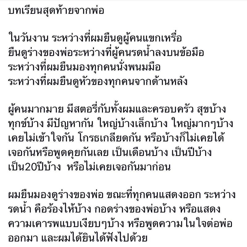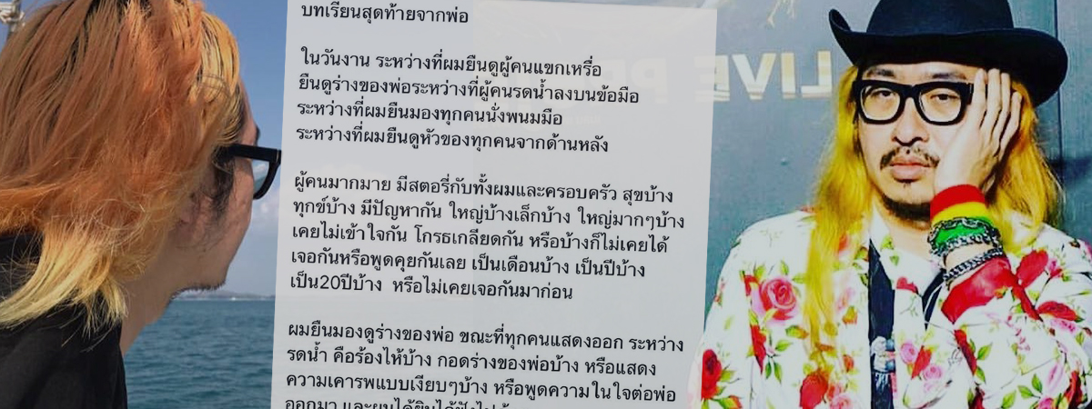 ภายหลังนักดนตรีชื่อดัง สอง พาราด็อกซ์ ต้องสูญเสียคุณพ่อไปอย่างกะทันหัน ท่ามกลางความเสียใจของครอบครัวที่ต้องสูญเสียบุคคลอันเป็นที่รักไปอย่างไม่มีวันกลับ ล่าสุด (6 มีนาคม 2562) สอง ก็ได้ออกมาเผยแง่คิดดี ๆ ซึ่งเป็นบทเรียนสุดท้ายจากคุณพ่อผู้ล่วงลับที่ทำให้เจ้าตัวได้นำไปปรับใช้และคลายปมต่าง ๆ ในชีวิตได้