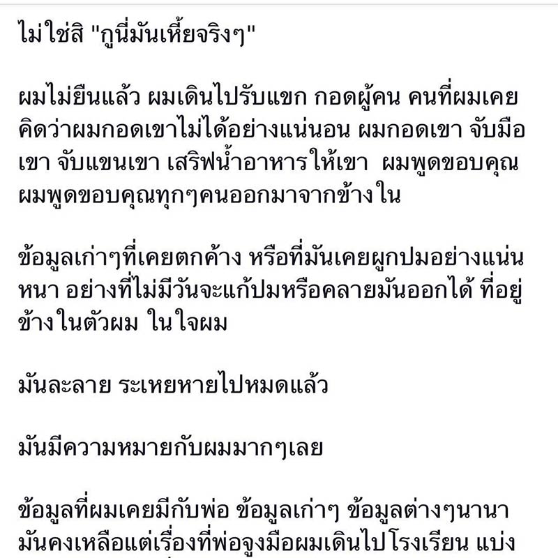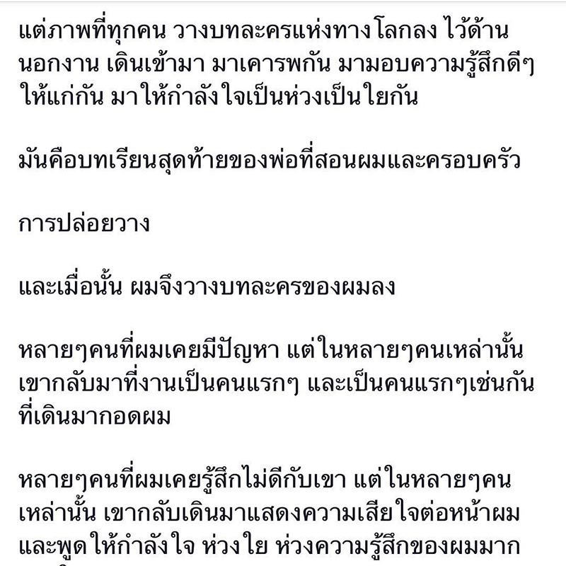 แต่เหตุการณ์ครั้งนี้ทำให้เขาได้เห็น ได้บทเรียนสำคัญจากคุณพ่อ ทำให้เขาเปลี่ยนความคิดและรู้จักการปล่อยวาง ว่าควรวางบทละครทางโลกที่สร้างขึ้นด้วยความเกลียดชังลง หลาย ๆ คนที่เขาเคยรู้สึกไม่ดีด้วย แต่คนเหล่านั้นกลับเดินมาให้กำลังใจเขา ทำให้เขากล้าที่จะเดินออกจากจุดนั้น คลายปมในใจหลาย ๆ อย่างที่คิดมานาน แล้วทุกอย่างก็ดูสวยงามขึ้น