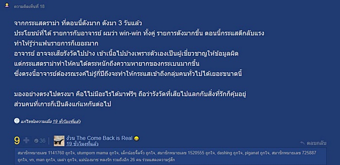 คุณ ง้วน The Come Back is Real กล่าวอีกว่า สิ่งที่นักแสดงหนุ่มไม่เคยเห็นและไม่เคยกินมาก่อน ไม่ได้แปลว่ามันเป็นของแปลกสำหรับทุกคน เพราะชาวประมงใกล้ทะเลก็กินปลากระเบนกันมานานแล้ว สิ่งที่ ปั้นจั่น วิจารณ์ออกมา ทำให้รู้สึกรับไม่ได้ และถ้าหากเป็นรายการที่ฉายทางช่องตัวเขา เขาคงไม่ออกตัวแรงขนาดนี้