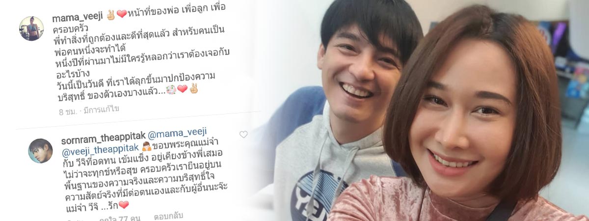 โดยภายหลัง สาวติ๊ก ออกมาโพสต์ข้อความดังกล่าว หนุ่ม ศรราม ก็ได้ออกมาคอมเมนต์ขอบคุณภรรยาว่า "ขอบพระคุณแม่จ๋า @veeji_theappitak กับวีจิที่อดทน เข้มแข็ง อยู่เคียงข้างพี่เสมอ ไม่ว่าจะทุกข์หรือสุข ครอบครัวเรายืนอยู่บนพื้นฐานของความจริงและความบริสุทธิ์ใจ ความสัตย์จริงที่มีต่อตนเองและกับผู้อื่นนะจ๊ะแม่จ๋า วีจิ ....รัก"