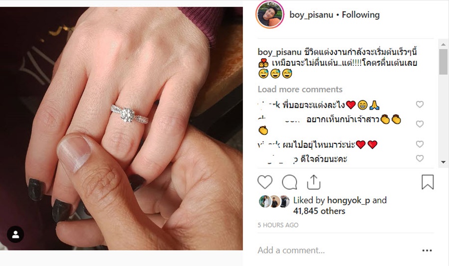หลังจากที่หนุ่ม บอย พิษณุ ทำเซอร์ไพรส์ คุกเข่าขอ อแมนด้า แฟนสาวชาวสวีเดน แต่งงานกลางเมือง ท่ามกลางความประทับใจและความยินดีของหลาย ๆ คน ล่าสุด (11 มีนาคม 2562) บอย พิษณุ ก็ได้เผยภาพโชว์แหวนหมั้นที่นิ้วมือของ อแมนด้า พร้อมข้อความว่า..