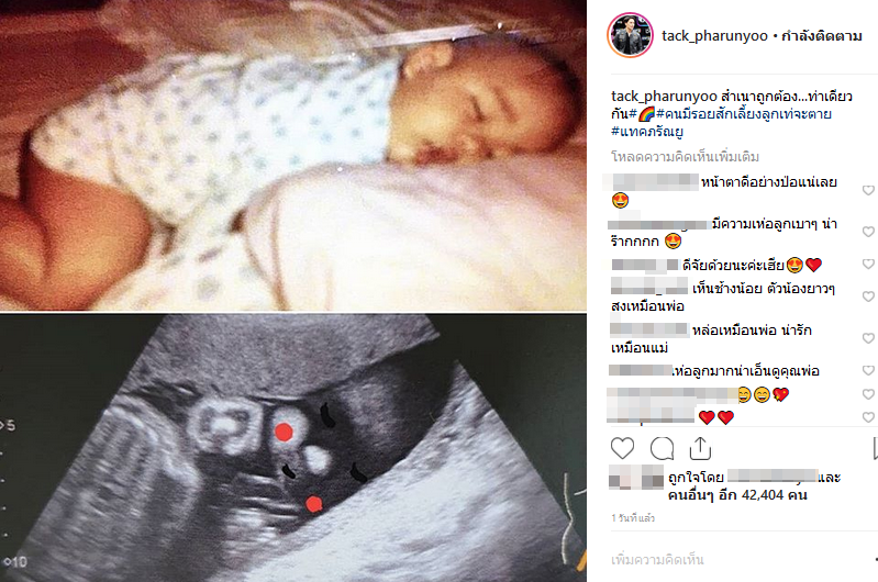 ล่าสุดหนุ่มแทค ก็ได้ออกมาเปิดเผยภาพอัลตราซาวด์ลูกในท้องให้แฟน ๆ ได้ชมด้วย ซึ่งก็ดูเหมือนว่าเจ้าตัวน้อยจะมีพัฒนาการดีมาก ๆ แถม หนุ่มแทค ยังเอาภาพตัวเองตอนเด็ก ๆ มาเทียบอีกต่างหาก และยังบอกด้วยว่า "สำเนาถูกต้อง...ท่าเดียวกัน #คนมีรอยสักเลี้ยงลูกเท่จะตาย #แทคภรัณยู"
