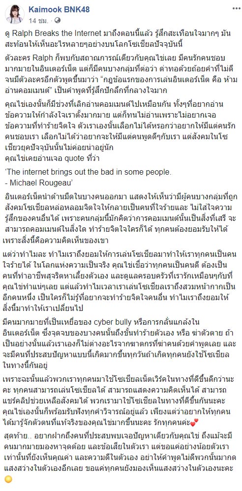 ล่าสุด (12 มีนาคม 2562) เฟซบุ๊ก Kaimook BNK48 ได้โพสต์ข้อความยาวเหยียด มีใจความกล่าวถึง การใช้โซเชียลของคนในปัจจุบัน ที่บางคนถูกอินเทอร์เน็ตดึงด้านมืดออกมา ใช้ทำร้ายผู้อื่น ซึ่งคนกลุ่มนี้มักคิดว่าคอมเมนต์เป็นสิ่งเสรี จะคอมเมนต์อะไรก็ได้
