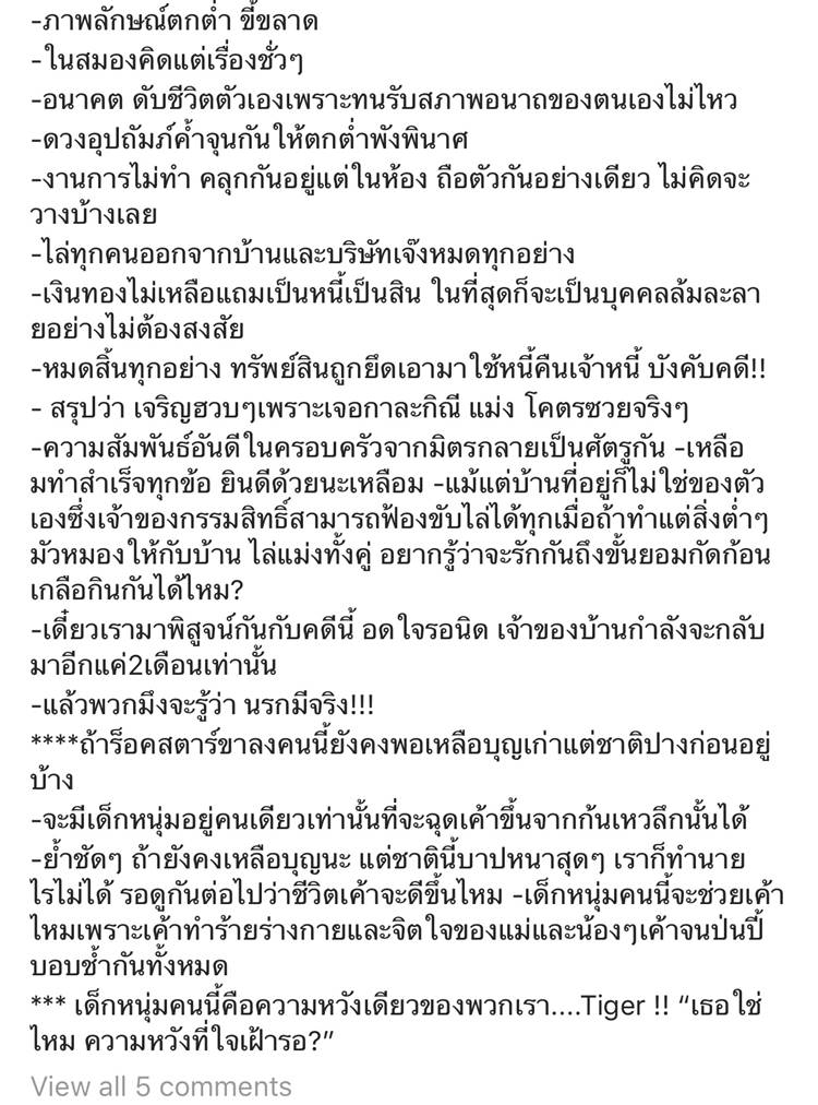 ย้ำชัด ๆ ถ้ายังคงเหลือบุญนะ แต่ชาตินี้บาปหนาสุด ๆ เราก็ทำนายอะไรไม่ได้ รอดูกันต่อไปว่าชีวิตเขาจะดีขึ้นไหม เด็กหนุ่มคนนี้จะช่วยเขาไหม เพราะเขาทำร้ายร่างกายและจิตใจของแม่และน้อง ๆ เขาจนป่นปี้ บอบช้ำกันทั้งหมด
