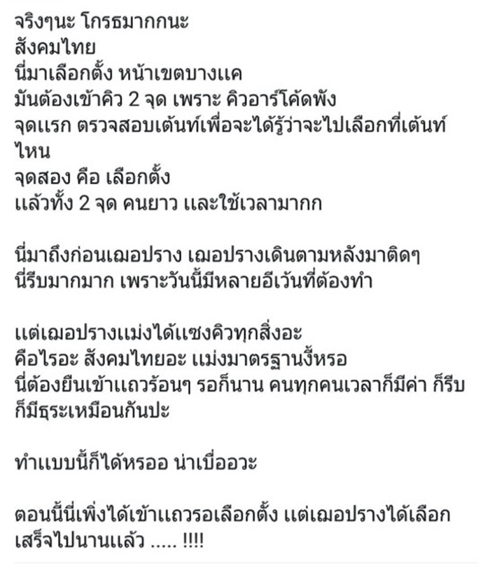 นอกจากนี้ยังมีคนที่ไปที่จุดเลือกตั้ง ได้ทวีตภาพและข้อความเป็นหลักฐานด้วยว่า "ภาพหลังผมถ่ายตั้งแต่แรก ไม่มีการแซงคิว จะเชื่อพวกปั่นทำไม ผมยืนยันให้ ทั้งรูปทั้งคลิปเต็มโทรศัพท์แล้วงับ เต็นท์นั้นคนน้อยเลยเสร็จเร็วค้าบ สบายใจได้ ผมคามิเจน แต่เห็นกัปตันโดนแกล้งก็พร้อมช่วยครับ เผื่อมีคนคาใจทำไมน้องถึงเสร็จไว ก็แถวมีคนแค่นี้ไม่ถึง 5 คน คุณจะให้รอเป็นชั่วโมงเหรอ หลักฐานพร้อม จบนะ"