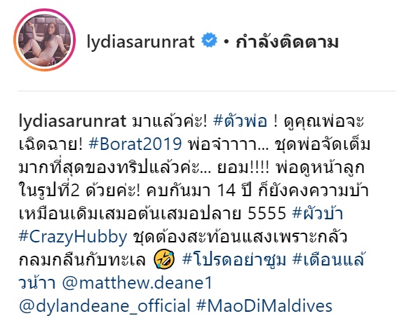 งานนี้สาวลีเดีย ยังมีแคปชั่นเตือนแฟน ๆ ด้วยว่า "มาแล้วค่ะ ! #ตัวพ่อ ! ดูคุณพ่อจะเฉิดฉาย ! #Borat2019 พ่อจ๋าาาา... ชุดพ่อจัดเต็มมากที่สุดของทริปแล้วค่ะ... ยอม!!!! พ่อดูหน้าลูกในรูปที่ 2 ด้วยค่ะ ! คบกันมา 14 ปี ก็ยังคงความบ้าเหมือนเดิมเสมอต้นเสมอปลาย 5555 #ผัวบ้า #CrazyHubby ชุดต้องสะท้อนแสงเพราะกลัวกลมกลืนกับทะเล #โปรดอย่าซูม #เตือนแล้วน้าา"