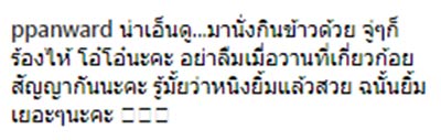 เมื่อได้ยินคำตอบแบบนี้ ทำเอาเพื่อนรักอย่างสาวเป้ยก็อดหัวเราะไม่ได้ พร้อมกล่าวว่า "เอ็นดู๊เอ็นดู" เพราะเพื่อนคนนี้น่ารักจริง ๆ โดยสาวเป้ยยังเขียนแคปชั่นถึงโมเมนต์ นี้ไว้ด้วยว่า "น่าเอ็นดู...มานั่งกินข้าวด้วย จู่ ๆ ก็ร้องไห้ โอ๋โอ๋นะคะ อย่าลืมเมื่อวานที่เกี่ยวก้อยสัญญากันนะคะ รู้มั้ยว่าหนิงยิ้มแล้วสวย ฉะนั้นยิ้มเยอะ ๆ นะคะ"