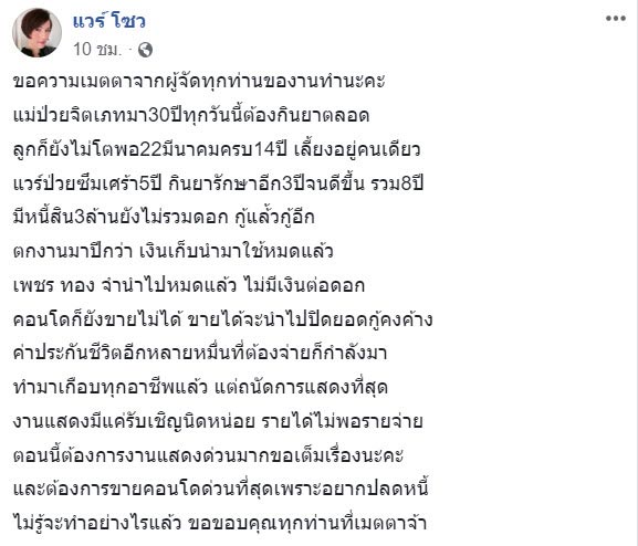 "ขอความเมตตาจากผู้จัดทุกท่านของานทำนะคะ แม่ป่วยจิตเภทมา 30 ปี ทุกวันนี้ต้องกินยาตลอด ลูกก็ยังไม่โตพอ 22 มีนาคม ครบ 14 ปี เลี้ยงอยู่คนเดียว แวร์ป่วยซึมเศร้า 5 ปี กินยารักษาอีก 3 ปี จนดีขึ้น รวม 8 ปี มีหนี้สิน 3 ล้าน ยังไม่รวมดอก กู้แล้วกู้อีก ตกงานมาปีกว่า เงินเก็บนำมาใช้หมดแล้ว เพชร ทอง จำนำไปหมดแล้ว ไม่มีเงินต่อดอก คอนโดก็ยังขายไม่ได้ ขายได้จะนำไปปิดยอดกู้คงค้าง ค่าประกันชีวิตอีกหลายหมื่นที่ต้องจ่ายก็กำลังมา