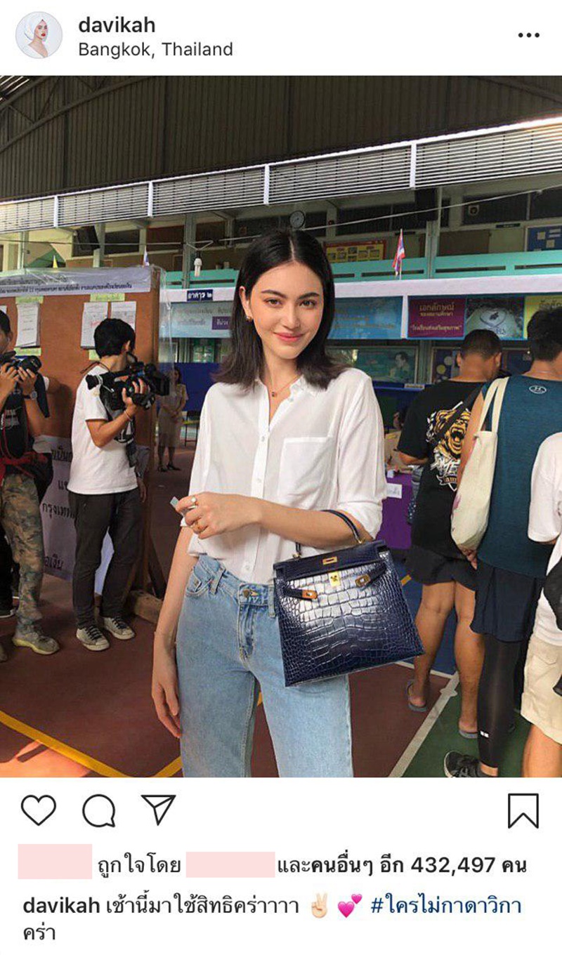 นอกจากนี้ สาวใหม่ยังได้โพสต์ภาพของตนเองที่หน่วยเลือกตั้ง ซึ่งมีแคปชั่นใส่มุกเบา ๆ ระบุว่า "เช้านี้มาใช้สิทธิ์คร่า #ใครไม่กาดาวิกา คร่า" ทำเอาแฟนคลับอดขำไม่ได้ คอมเมนต์ชอบแฮชแท็กของเจ้าตัวกันเพียบ ว่าแต่.. เดี๋ยวนี้มีปล่อยมงปล่อยมุกขำ ๆ สงสัยจะติดลุงเต๋อมาหรือเปล่าจ๊ะ ดาวิกา