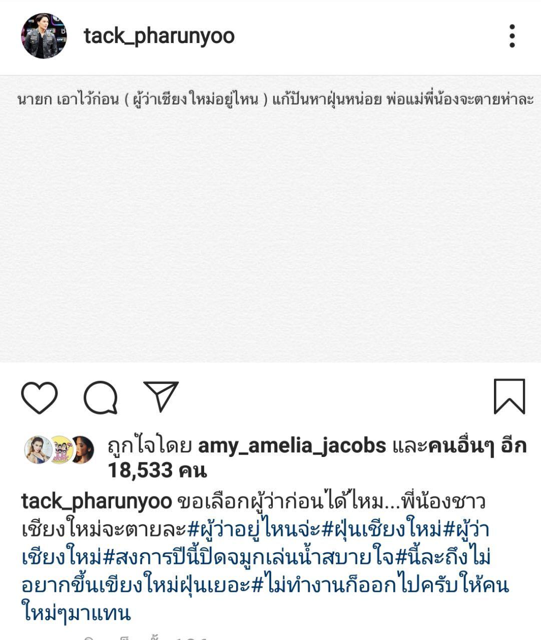 และล่าสุด (25 มีนาคม 2562) แทค ภรัณยู ก็ได้ลงข้อความใน IG ว่า "นายก เอาไว้ก่อน (ผู้ว่าเชียงใหม่อยู่ไหน) แก้ปัญหาฝุ่นหน่อย พ่อแม่พี่น้องจะตายห่-ละ" และ "ขอเลือกผู้ว่าก่อนได้ไหม...พี่น้องชาวเชียงใหม่จะตายละ #ผู้ว่าอยู่ไหนจ่ะ #ฝุ่นเชียงใหม่ #ผู้ว่าเชียงใหม่ #สงการปีนี้ปิดจมูกเล่นน้ำสบายใจ #นี่ละถึงไม่อยากขึ้นเชียงใหม่ฝุ่นเยอะ #ไม่ทำงานก็ออกไปครับให้คนใหม่ๆมาแทน"