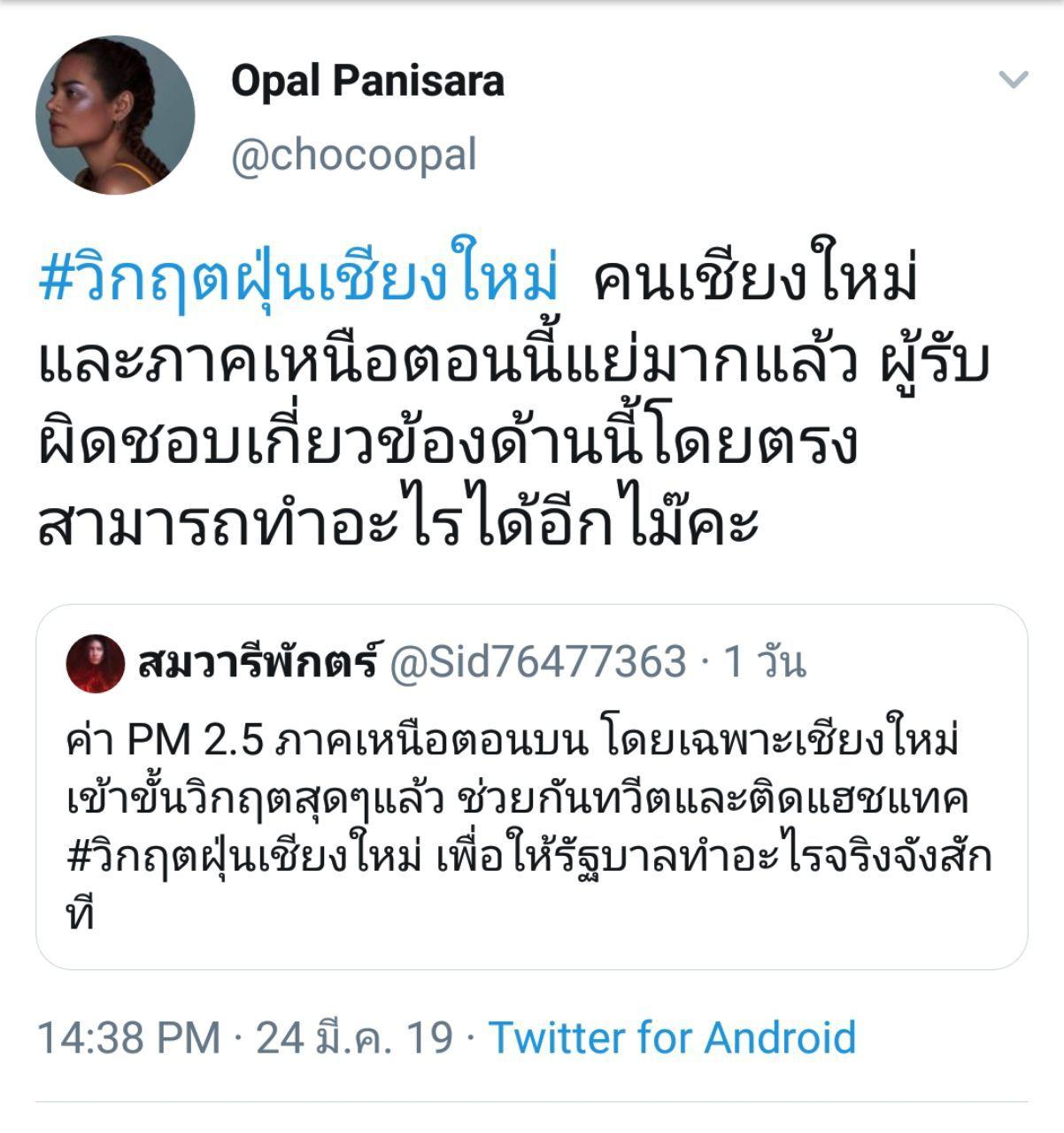 โอปอล์ เป็นห่วงปัญหา วิกฤตฝุ่นเชียงใหม่ ถามผู้รับผิดชอบ ทำอะไรได้อีกไหม ด้าน แม็กซ์ เจนมานะ ประณามผู้รับผิดชอบ แทค จี้ถามหาผู้ว่าฯ อยู่ไหน !?