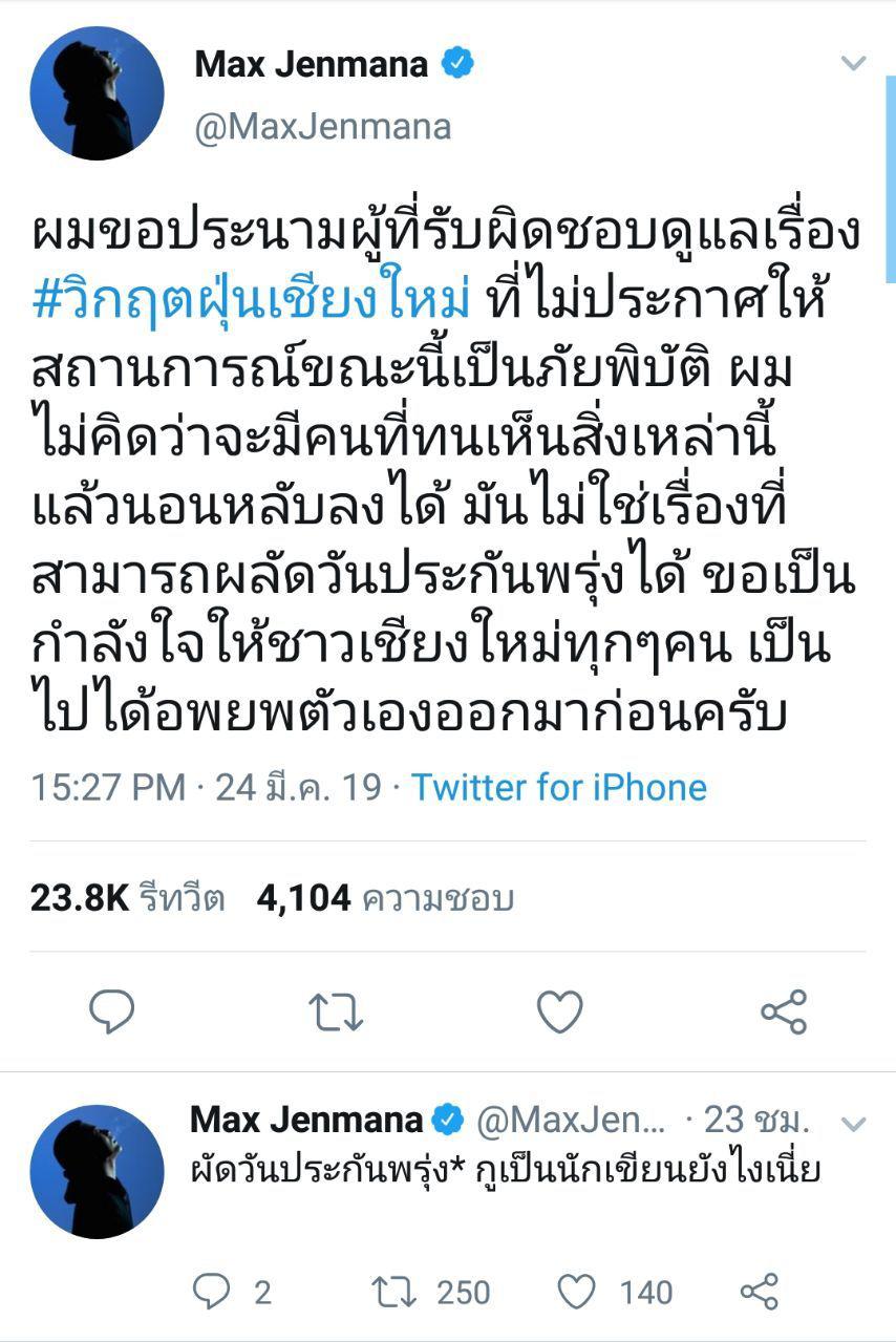 ทางด้าน แม็กซ์ เจนมานะ ก็โพสต์ว่า "ผมขอประณามผู้ที่รับผิดชอบดูแลเรื่อง #วิกฤตฝุ่นเชียงใหม่ ที่ไม่ประกาศให้สถานการณ์ขณะนี้เป็นภัยพิบัติ ผมไม่คิดว่าจะมีคนที่ทนเห็นสิ่งเหล่านี้แล้วนอนหลับลงได้ มันไม่ใช่เรื่องที่สามารถผัดวันประกันพรุ่งได้ ขอเป็นกำลังใจให้ชาวเชียงใหม่ทุก ๆ คน เป็นไปได้อพยพตัวเองออกมาก่อนครับ"