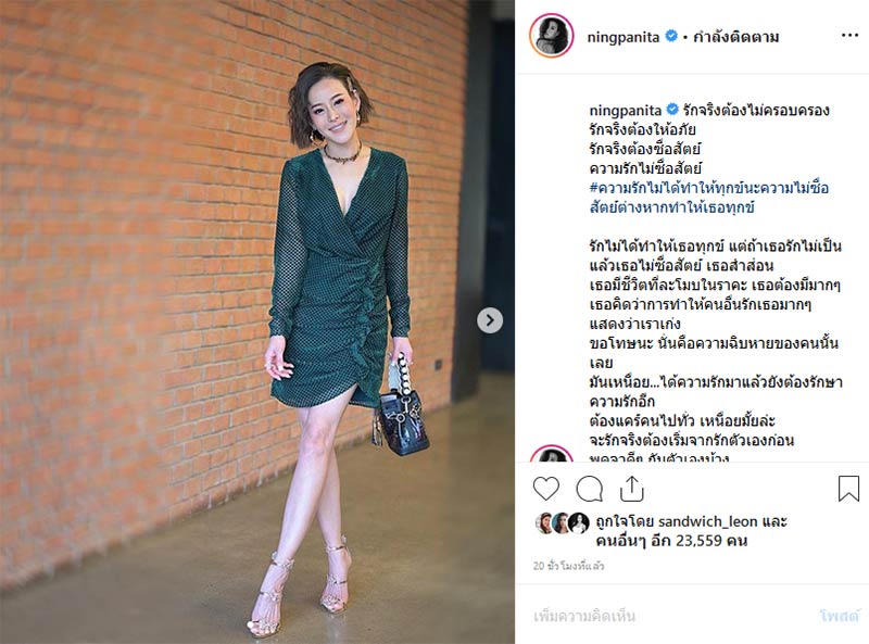 โดยข้อความทั้งหมดมีดังนี้ "รักจริงต้องไม่ครอบครอง รักจริงต้องให้อภัย รักจริงต้องซื่อสัตย์ ความรักไม่ซื่อสัตย์ #ความรักไม่ได้ทำให้ทุกข์นะความไม่ซื่อสัตย์ต่างหากทำให้เธอทุกข์