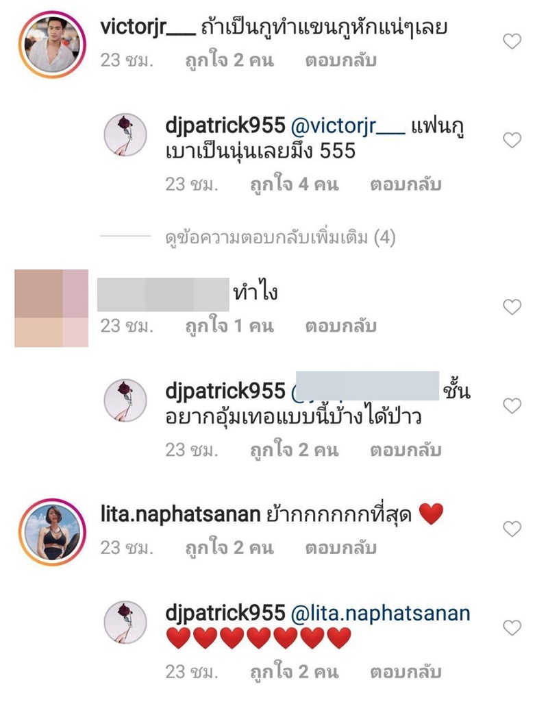 งานนี้ทำเอาเพื่อนอย่างหนุ่ม วิคเตอร์ ปวรพัฒน์ เข้ามาคอมเมนต์แซวว่า "ถ้าเป็นกูทำแขนกูหักแน่ ๆ เลย" ก่อนที่หนุ่มแพทริค จะตอบกลับแบบชิล ๆ ว่า "แฟนกูเบาเป็นนุ่นเลยมึง 555"