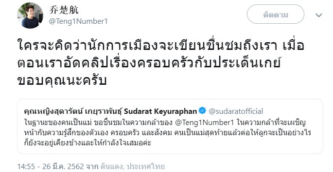 โดยล่าสุด (26 มีนาคม 2562) เต็งหนึ่ง ได้โควตข้อความดังกล่าวของ คุณหญิงสุดารัตน์ มาแชร์อีกครั้ง พร้อมเผยความประทับใจว่า "ใครจะคิดว่านักการเมืองจะเขียนชื่นชมถึงเรา เมื่อตอนเราอัดคลิปเรื่องครอบครัวกับประเด็นเกย์ ขอบคุณนะครับ"
