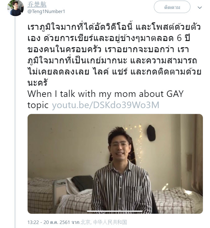เป็นประเด็นฮือฮาเมื่อช่วงเดือนตุลาคมที่ผ่านมา หลังจาก เต็งหนึ่ง อดีตสมาชิกวงบอยแบนด์ B.O.Y ได้อัดคลิปวิดีโอเปิดใจ เปิดตัวว่าตนเองเป็นเกย์ และเล่าเรื่องราวตอนที่เผยถึงเรื่องนี้กับคุณแม่ ซึ่งก็ทำเอาหลายคนประทับใจ และชื่นชมเกี่ยวกับเรื่องนี้