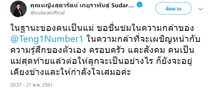 เช่นเดียวกับ คุณหญิงสุดารัตน์ เกยุราพันธุ์ นักการเมืองชื่อดัง ที่ในตอนนั้น เคยได้โพสต์ชื่นชมเต็งหนึ่งไว้ว่า "ในฐานะของคนเป็นแม่ ขอชื่นชมในความกล้าของ @Teng1Number1 ในความกล้าที่จะเผชิญหน้ากับความรู้สึกของตัวเอง ครอบครัว และสังคม คนเป็นแม่สุดท้ายแล้วต่อให้ลูกจะเป็นอย่างไร ก็ยังจะอยู่เคียงข้างและให้กำลังใจเสมอค่ะ"