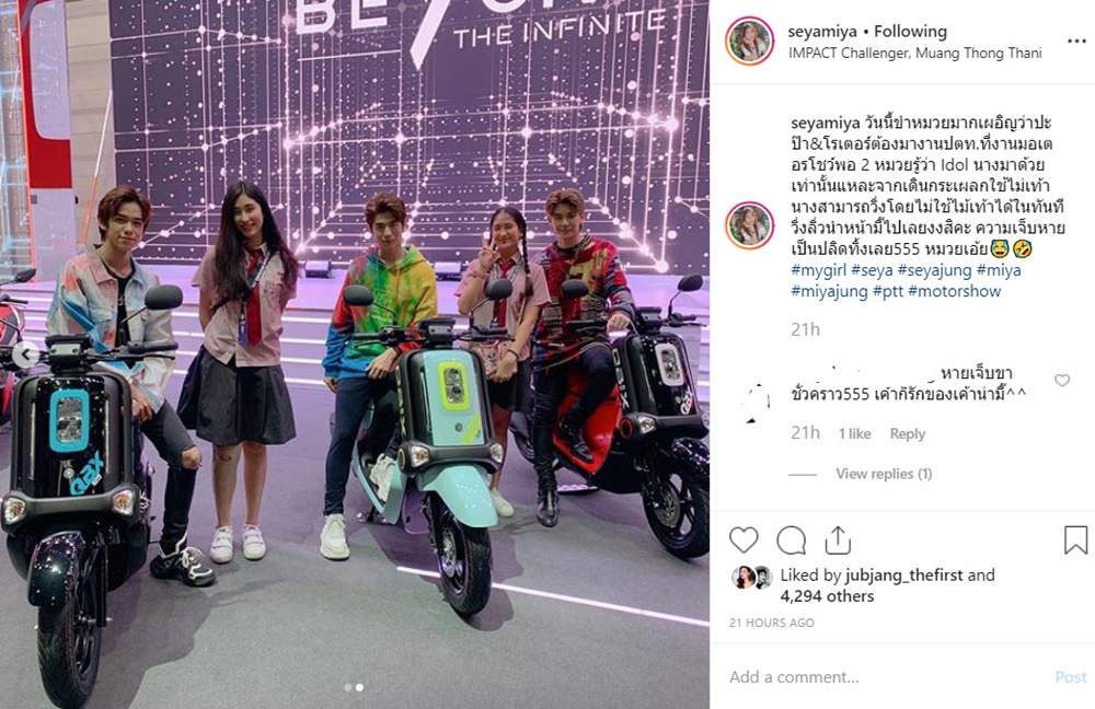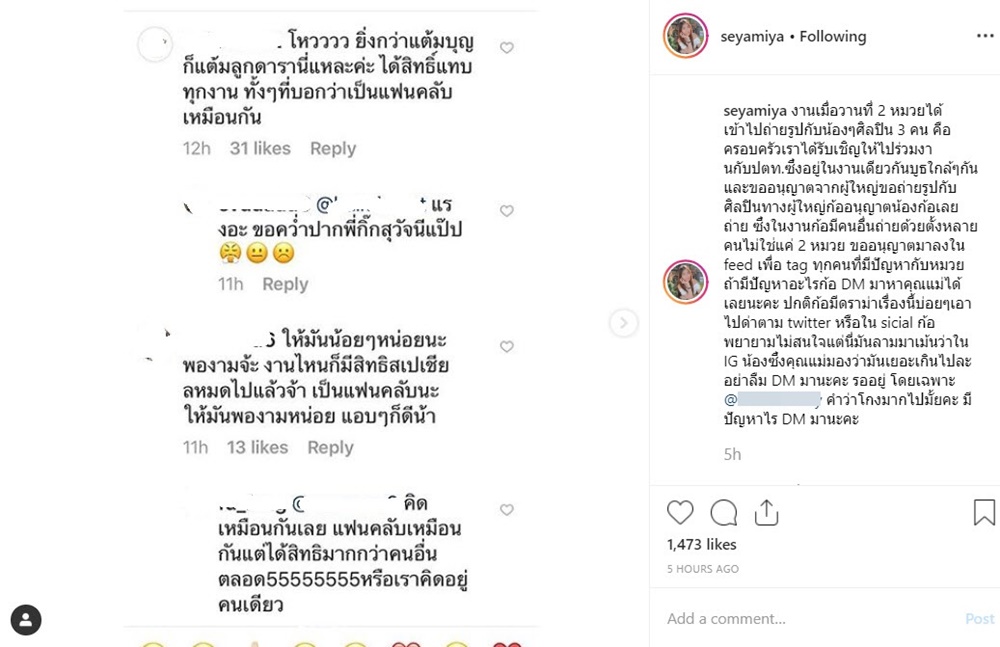 ล่าสุด (27 มีนาคม 2562) แม่เจ็ง เลยได้แคปคอมเมนต์ต่าง ๆ มาลงใน IG พร้อมชี้แจงเกี่ยวกับเรื่องนี้ว่า "งานเมื่อวานที่ 2 หมวย ได้เข้าไปถ่ายรูปกับน้อง ๆ ศิลปิน 3 คน คือครอบครัวเราได้รับเชิญให้ไปร่วมงานกับ ปตท. ซึ่งอยู่ในงานเดียวกันบูธใกล้ ๆ กัน และขออนุญาตจากผู้ใหญ่ขอถ่ายรูปกับศิลปิน ทางผู้ใหญ่ก็อนุญาต น้องก็เลยถ่าย ซึ่งในงานก็มีคนอื่นถ่ายด้วยตั้งหลายคน ไม่ใช่แค่ 2 หมวย ขออนุญาตมาลงใน feed เพื่อ tag ทุกคนที่มีปัญหากับหมวย ถ้ามีปัญหาอะไรก็ DM มาหาคุณแม่ได้เลยนะคะ ปกติก็มีดราม่าเรื่องนี้บ่อย ๆ เอาไปด่าตาม twitter หรือใน social ก็พยายามไม่สนใจ แต่นี่มันลามมาเมนต์ว่าใน IG น้อง ซึ่งคุณแม่มองว่ามันเยอะเกินไปละ อย่าลืม DM มานะคะ รออยู่ โดยเฉพาะ ******* คำว่าโกงมากไปมั้ยคะ มีปัญหาไร DM มานะคะ"