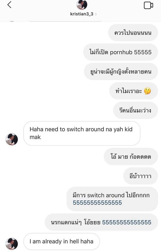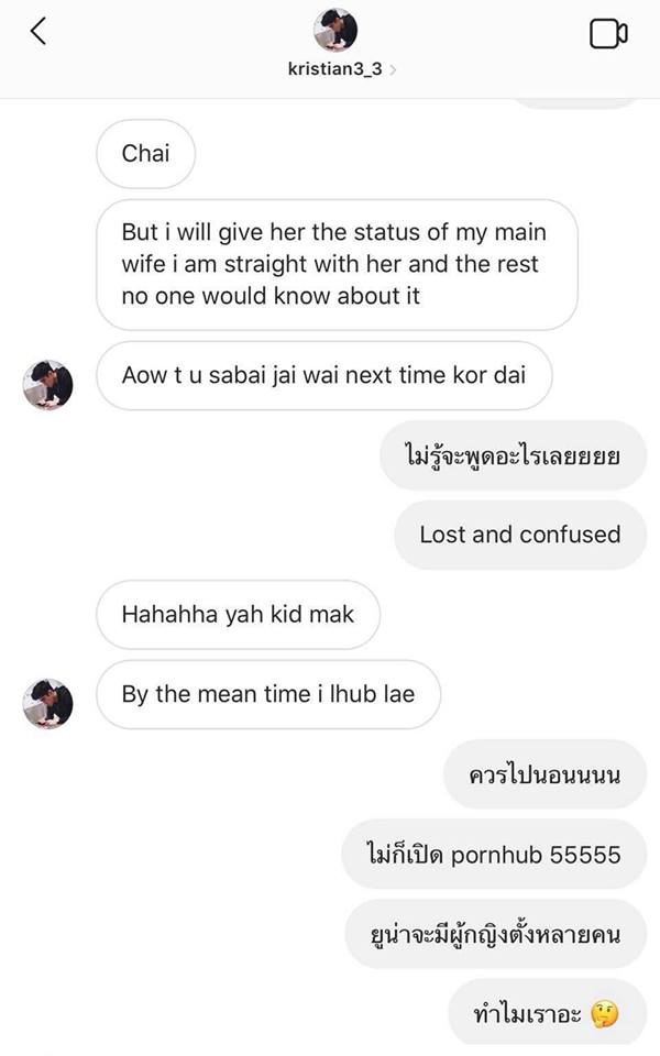 เนื้อหาภายในแชตหลุดดังกล่าวระบุว่า ฝ่ายชายที่อ้างเป็นคริสเตียน กล่าวถึงผู้หญิงคนหนึ่ง ซึ่งตัวเองมอบสถานะภรรยาให้ แต่อื่น ๆ นอกเหนือจากนี้ ไม่มีใครรู้ ฝ่ายหญิงสาวก็ตอบไปว่าทำไมถึงมาชวนตัวเองคุย ผู้หญิงคนอื่นก็น่าจะมีเยอะแยะ อีกฝ่ายก็ตอบกลับมาว่า ตัวเอง switch around อยู่แล้ว ซึ่งหมายความได้ว่า คั่วไปเรื่อย ๆ หรือจีบคนโน้นคนนี้ไปเรื่อย