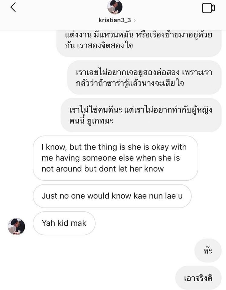 โดยในวันที่ 30 มีนาคม 2562 ไบรท์ทีวี รายงานว่า ชาวโซเชียลที่ติดตาม ซาร่า และ คริสเตียน พบว่าทั้งคู่ไม่ได้ไปกดไลก์ หรือไปคอมเมนต์ในอินสตาแกรมของกันและกันมาพักใหญ่ อีกทั้งล่าสุด โลกออนไลน์ก็มีการเผยแพร่ภาพหน้าจอการสนทนาในอินสตาแกรม หรือไดเรกต์เมสเสจ เป็นการคุยกันระหว่างหญิงสาวปริศนาคนหนึ่ง กับชายหนุ่มที่อ้างว่าเป็นคริสเตียน แฟนหนุ่มของสาวซาร่า