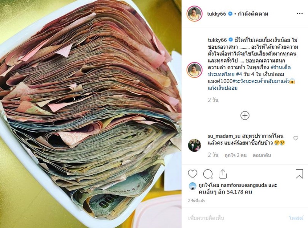 โดยเจ้าตัวได้ออกมาโพสต์ภาพแบงก์จำนวนมากที่อัดแน่นอยู่ภายในกระเป๋า พร้อมข้อความว่า "ชีวิตที่ไม่เคยเกี่ยงเงินน้อย ไม่ชอบรอวาสนา ......... อะไรที่ได้มาด้วยความตั้งใจเมื่อทำได้จะไชโยเสียงดังมากทุกคนและทุกครั้งไป .... ขอบคุณความสนุก ความล่า ความบ้า ในทุกเรื่อง #ร้านเด็ดประเทศไทย #4 วัน 4 ใบ เงินปลอมแบงก์ 1,000 #ระวังนะคะเขากลับมาแล้ว แก๊งเงินปลอม"