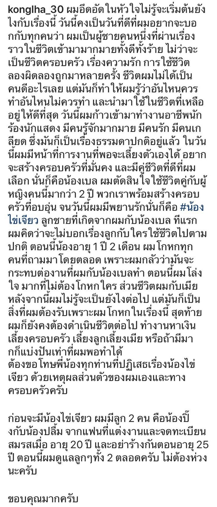 ในวันนี้ผมมีหน้าที่การงานที่พอจะเลี้ยงตัวเองได้ อยากจะสร้างครอบครัวที่มั่นคง และมีคู่ชีวิตที่ดีที่ผมเลือก นั่นก็คือน้องเบล ผมตัดสินใจใช้ชีวิตคู่กับผู้หญิงคนนี้มากว่า 2 ปี พวกเราพร้อมสร้างครอบครัวที่อบอุ่น จนวันนี้ผมมีพยานรักนั่นก็คือ #น้องไข่เจียว ลูกชายที่เกิดจากผมกับน้องเบล ทีแรกผมคิดว่าจะไม่บอกเรื่องลูกกับใคร ใช้ชีวิตไปตามปกติ ตอนนี้น้องอายุ 1 ขวบ 2 เดือน ผมโกหกทุกคนที่ถามมาโดยตลอด เพราะผมกลัวว่ามันจะกระทบต่องานที่ผมกับน้องเบลทำ ตอนนี้ผมโล่งใจมากที่ไม่ต้องโกหกใคร