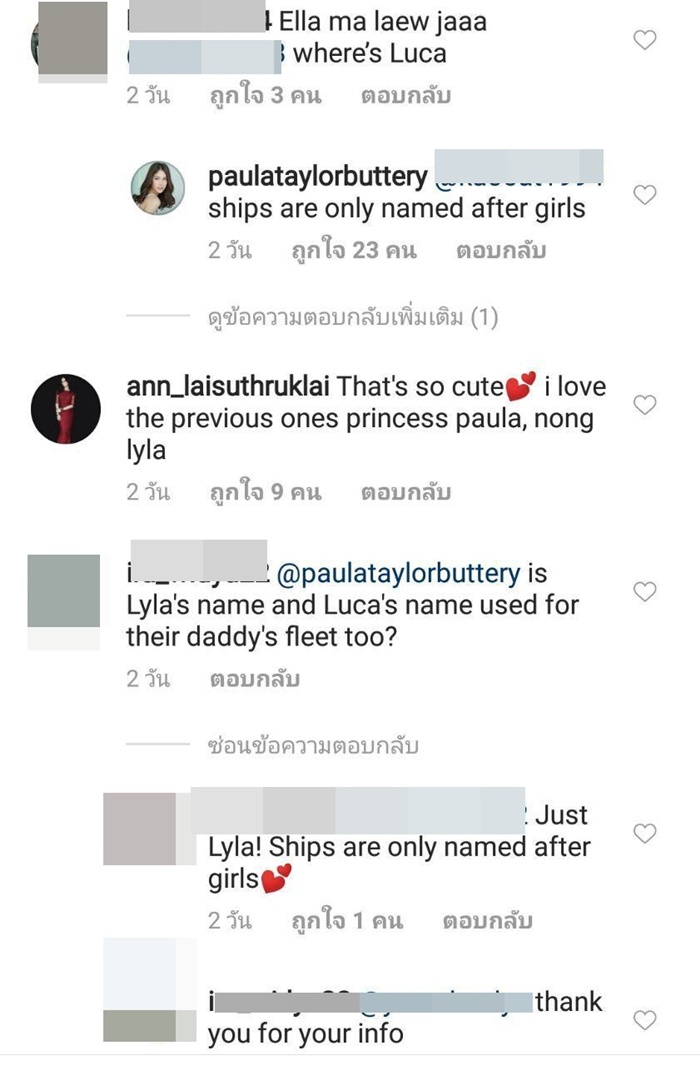 งานนี้ทำเอาหลายคนประทับใจ เรียกว่าแค่รวยอย่างเดียวไม่ได้ ต้องทุ่มเท และคิดถึงลูกสาวมาก ๆ ถึงได้ตั้งชื่อเรือตามชื่อลูกแบบนี้ ทั้งนี้ เมื่อมีแฟน ๆ สงสัยว่า แล้วเรือตามชื่อ น้องลูก้า ล่ะ สาวพอลล่า ก็เข้ามาตอบกลับว่า "ships are only named after girls" เรือตั้งชื่อตามเด็กผู้หญิงเท่านั้นค่ะ