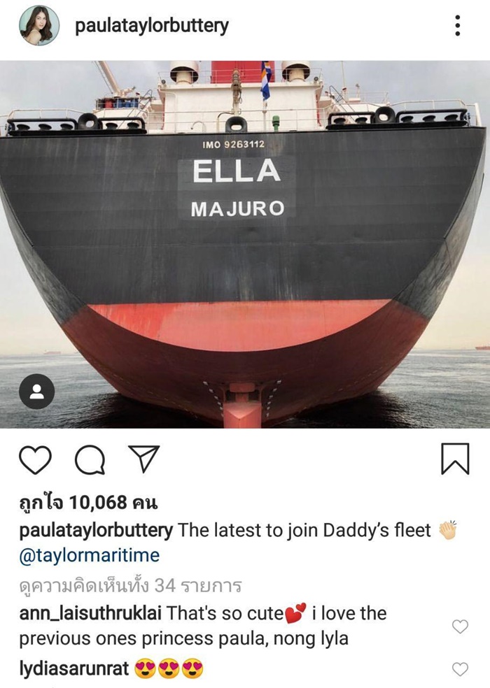 ล่าสุด พอลล่า ก็ทำเอาแฟน ๆ ฮือฮาอีกครั้ง เมื่อได้เผยภาพเรือสินค้าขนาดยักษ์ลำล่าสุดของคุณสามี ที่ตั้งชื่อว่า "ELLA Majuro" ตามชื่อของลูกสาวคนเล็ก น้องเอลล่า นั่นเอง พร้อมแคปชั่นว่า "The latest to join Daddy’s fleet"