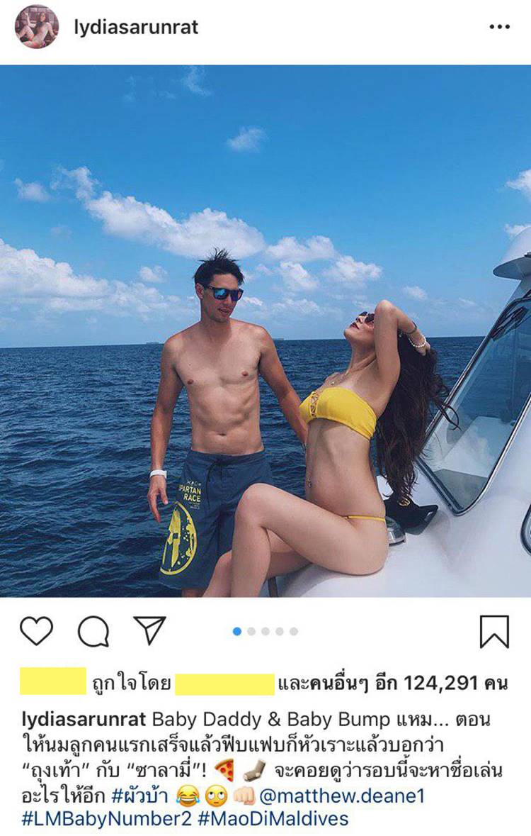 แถมด้วยภาพสวีตแนบชิดสามีบนเรือกลางทะเล จูจุ๊บกันดูดดื่ม แซ่บไม่เกรงใจเบบี๋ในท้อง เรียกได้ว่าวันเวลาไม่เคยทำให้ความหวานของคู่นี้ลดน้อยลงไปเลย โดยสาวลีเดีย ระบุแคปชั่นว่า "Baby Daddy & Baby Bump แหม... ตอนให้นมลูกคนแรกเสร็จแล้ว ฟีบ แฟบ ก็หัวเราะแล้วบอกว่า ถุงเท้า กับ ซาลามี่ จะคอยดูว่ารอบนี้จะหาชื่อเล่นอะไรให้อีก #ผัวบ้า #LMBabyNumber2 #MaoDiMaldives"