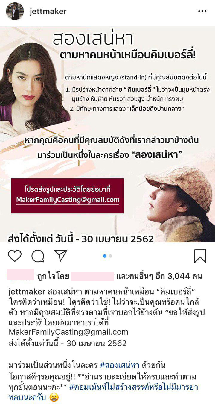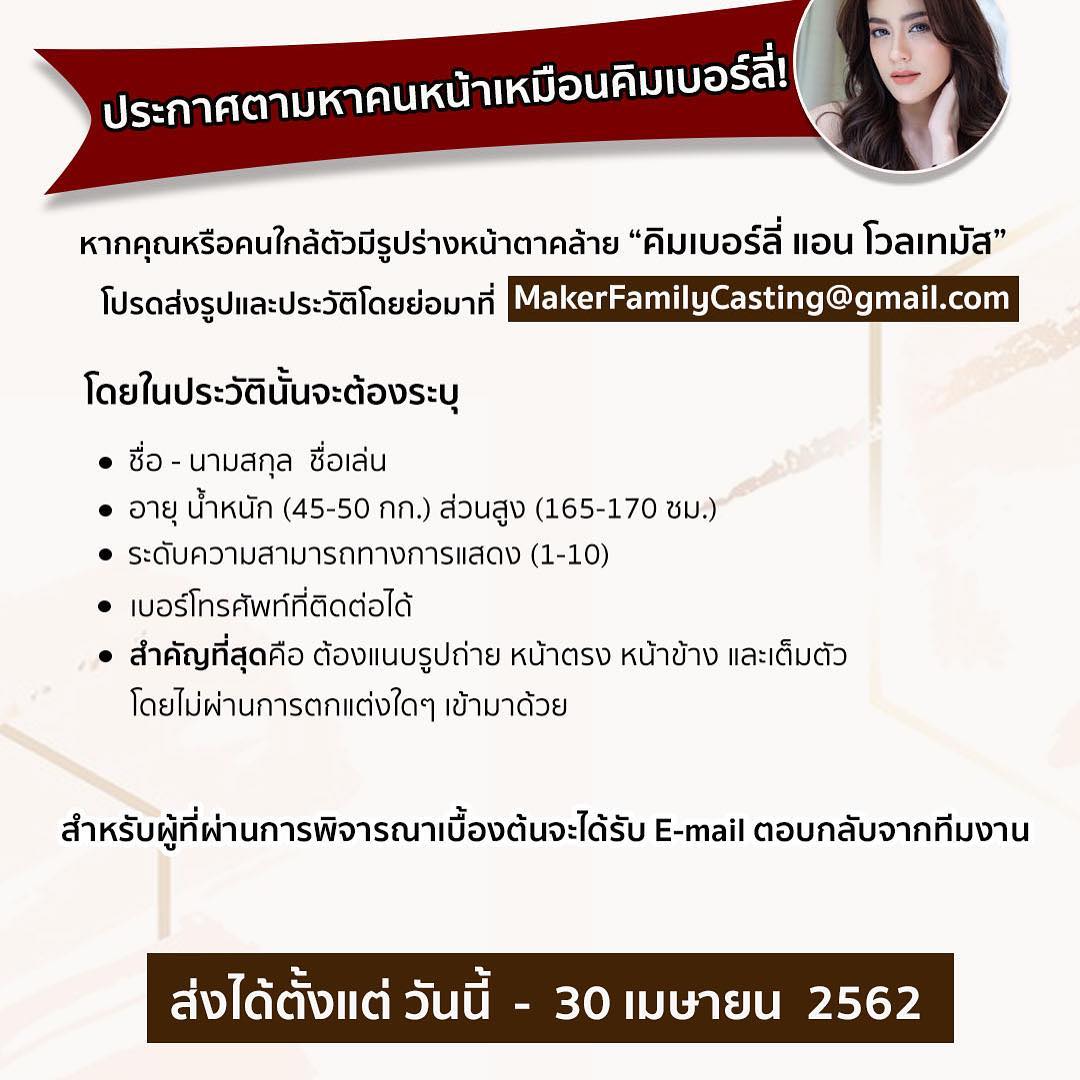 ใครคิดว่าเหมือน ! ใครคิดว่าใช่ ! ไม่ว่าจะเป็นคุณหรือคนใกล้ตัว หากมีคุณสมบัติตรงตามที่เราบอกไว้ข้างต้น ขอให้ส่งรูปและประวัติโดยย่อมาหาเราได้ที่ MakerFamilyCasting@gmail.com ส่งได้ตั้งแต่วันนี้ - 30 เมษายน 2562 มาร่วมเป็นส่วนหนึ่งในละคร #สองเสน่หา ด้วยกัน โอกาสดี ๆ รอคุณอยู่ **อ่านรายละเอียดให้ครบและทำตามทุกขั้นตอน** คอมเมนต์ไม่สร้างสรรค์หรือไม่มีมารยาทลบนะครับ