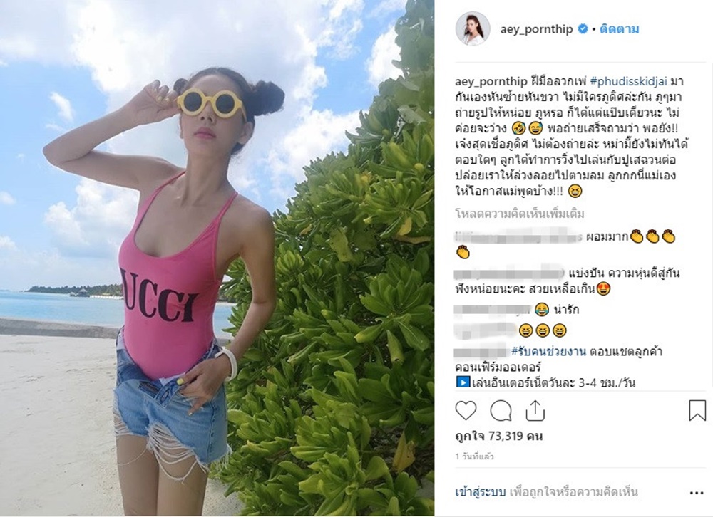 โดยแม่เอ๋ก็มีการโพสต์ภาพพร้อมแคปชั่นลงบนอินสตาแกรมส่วนตัวว่า "ฝีมือลวกเพ่ #phudisskidjai มากันเองหันซ้ายหันขวา ไม่มีใครภูดิศล่ะกัน ภู ๆ มาถ่ายรูปให้หน่อย ภูหรอ ก็ได้แต่แป๊บเดียวนะ ไม่ค่อยจะว่าง พอถ่ายเสร็จถามว่า พอยัง !! เจ๋งสุดเชื่อภูดิศ ไม่ต้องถ่ายละ หม่ามี๊ยังไม่ทันได้ตอบใด ๆ ลูกได้ทำการวิ่งไปเล่นกับปูเสฉวนต่อ ปล่อยเราให้ล่องลอยไปตามลม ลูกกกนี่แม่เอง ให้โอกาสแม่พูดบ้าง !!! "