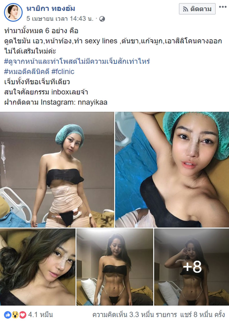 ทำเอาโลกออนไลน์ฮือฮา สำหรับสาวสวยหน้าคมเจ้าของเฟซบุ๊ก นายิกา ทองอ้ม กรณีเจ้าตัวโพสต์รูปถ่ายพร้อมรีวิวรูปร่างที่เป๊ะปัง หลังการทำศัลยกรรม 6 จุด ภายในครั้งเดียว ทั้งการดูดไขมันเอว, หน้าท้อง, ทำ sexy lines, ต้นขา, แก้จมูก และเอาซิลิโคนคางออก ตามที่มีรายงานไปแล้วนั้น (อ่านข่าว : แชร์กระจาย ! สาวใจเด็ด รีวิวศัลยกรรม 6 จุดรวดเดียว เปิดทุกขั้นตอน ที่มาของหุ่นเป๊ะ)