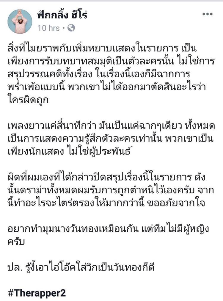 ต่อมา (17 เมษายน 2562) โค้ช กอล์ฟ ฟักกลิ้ง ฮีโร่ ก็ออกมาชี้แจงผ่านเฟซบุ๊ก ฟักกลิ้ง ฮีโร่ ระบุว่า การแสดงที่ผ่านมาเป็นบทบาทสมมุติของตัวละคร ไม่ได้ตัดสินว่าใครผิดใครถูก เป็นเพียงแค่ฉากเดียว ไม่ใช่การสรุปวรรณคดีทั้งเรื่อง อย่างไรก็ตาม ตนขอรับการตำหนิทั้งหมดไว้เอง จากนี้จะไตร่ตรองให้มากกว่านี้ ขออภัยจากใจ