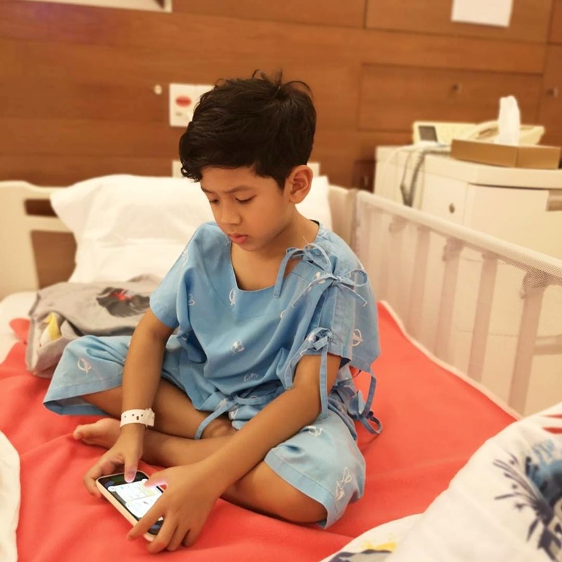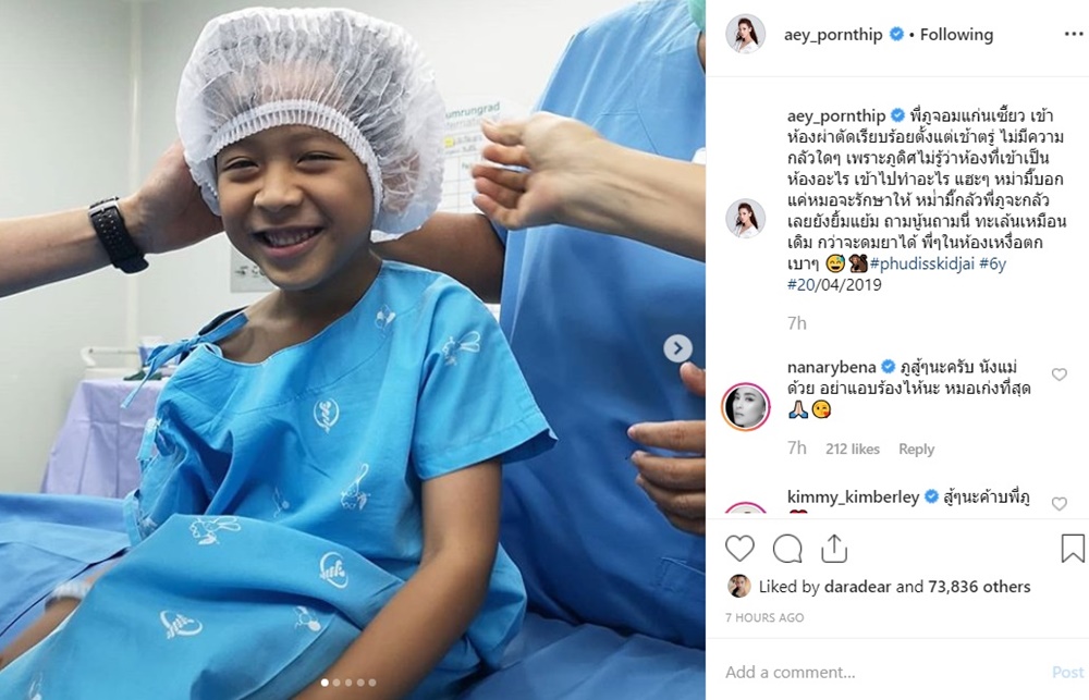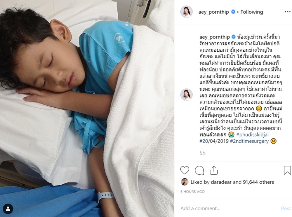 จากนั้น คุณแม่เอ๋ ก็ได้เผยถึงอาการป่วยของ น้องภูดิศ จนต้องเข้าห้องผ่าตัด และเล่าถึงความรู้สึกยากลำบากของคนเป็นแม่ ดังนี้ "น้องภูเข้า รพ. ครั้งนี้มารักษาอาการลูกอัณฑะข้างนึงโตผิดปกติ คุณหมอบอกว่ามีถุงค่อนข้างใหญ่ในอัณฑะ แต่ไม่มีน้ำ ไส้เริ่มเลื่อนลงมา คุณหมอได้ทำการเย็บปิดเรียบร้อย มีแผลที่ท้องน้อย ปลอดภัยดีทุกอย่างนะคะ มีฟื้นแล้วอาเจียนน่าจะเป็นเพราะฤทธิ์ยาสลบ แต่ดีขึ้นแล้วค่ะ
